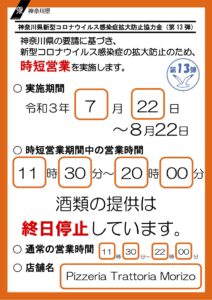 新型インフルエンザ等対策特別措置法に基づく県の要請に応じて、2021年7月22日から8月22日の間、ディナー営業時間を17時から20時(ラストオーダー19時)とさせていただきます。