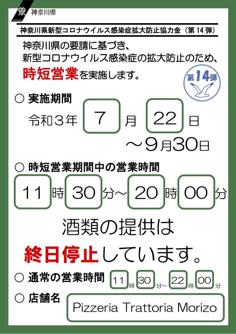 新型インフルエンザ等対策特別措置法に基づく県の要請に応じて9月30日まで、ディナー営業時間を17時から20時(ラストオーダー19時)とさせていただきます。